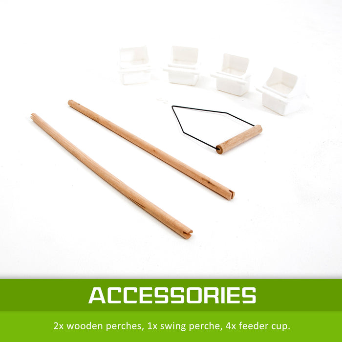 The cage's frame is made of durable and high-quality wrought iron and it is powder coated in order to prevent it from rusting and offer a longer service life. The cage could have 2 different shape arrangement(Full / Half Cage), suitable from small to medium size birds as well as you could match up with your spaces and furniture. Dual front access door so you can keep your bird safe and have easy access inside the cage. 4 feeder cup and 2 rest wooden perches and a swing perche that add a little bit of fun for your lovely birds.