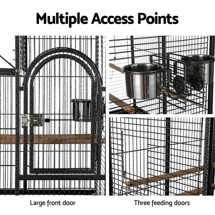 Explore the ultimate habitat for your feathered friends with this dynamic i.Pet bird cage. It seamlessly integrates playful elements like a climbing ladder and a toy hanger with practical features such as wooden perches and feeders. An undershelf provides additional storage space. The design emphasises ease of use, with a slide-out cleaning tray and a removable base for simple maintenance. Multiple doors offer effortless access to the cage, and the inclusion of smooth-rolling castor wheels ensures convenient mobility. Crafted with attention to detail, this cage is a haven of comfort and fun for your birds.