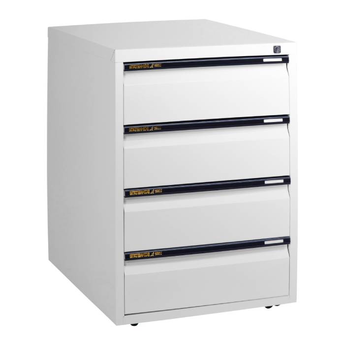 The Statewide mobile pedestals is an Australian made product constructed of Bluescope steel. Our key lockable cabinets boast a single piece body made of wrap around steel, giving the greatest level of strength and durability available in a mobile pedestal. The castors are recessed and are barely visible beneath the pedestals.