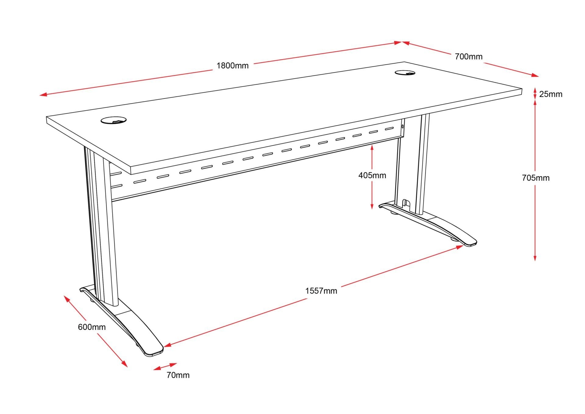 The desk range can be used as a stand alone desk or in workstation runs, with an E0 top with cable tidy, perforated metal modesty and adjustable feet.