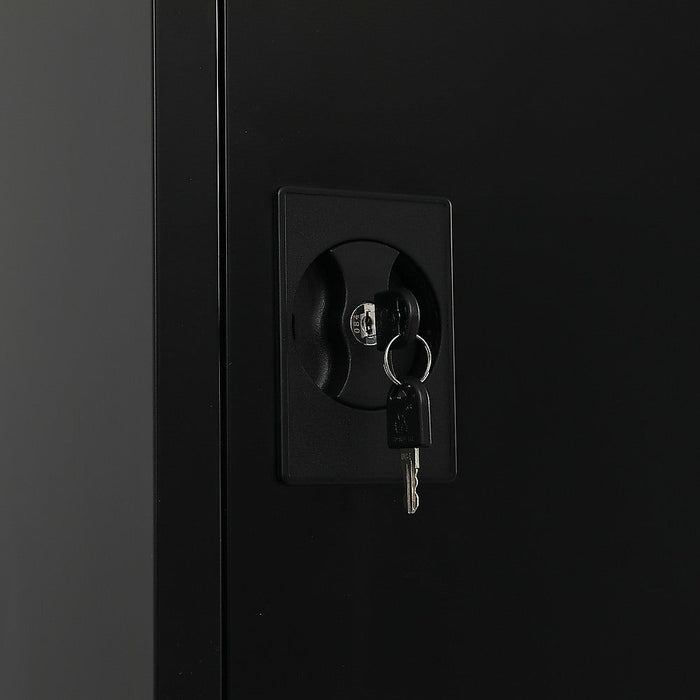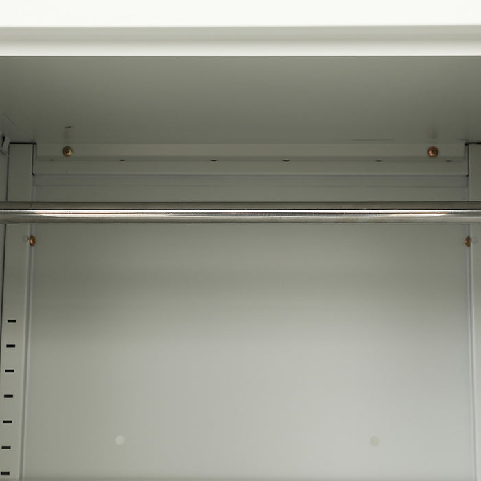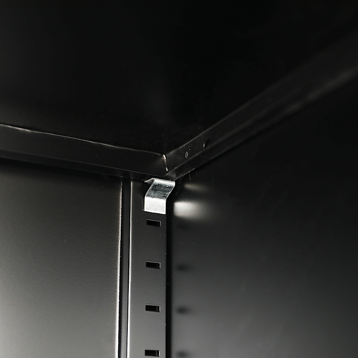 The steel material has a thickness of 0.6mm. The bottom panel is designed with side and central reinforcement, hidden metal hinges and galvanized screws. It has a concealed security lock and adjustable legs for greater stability.