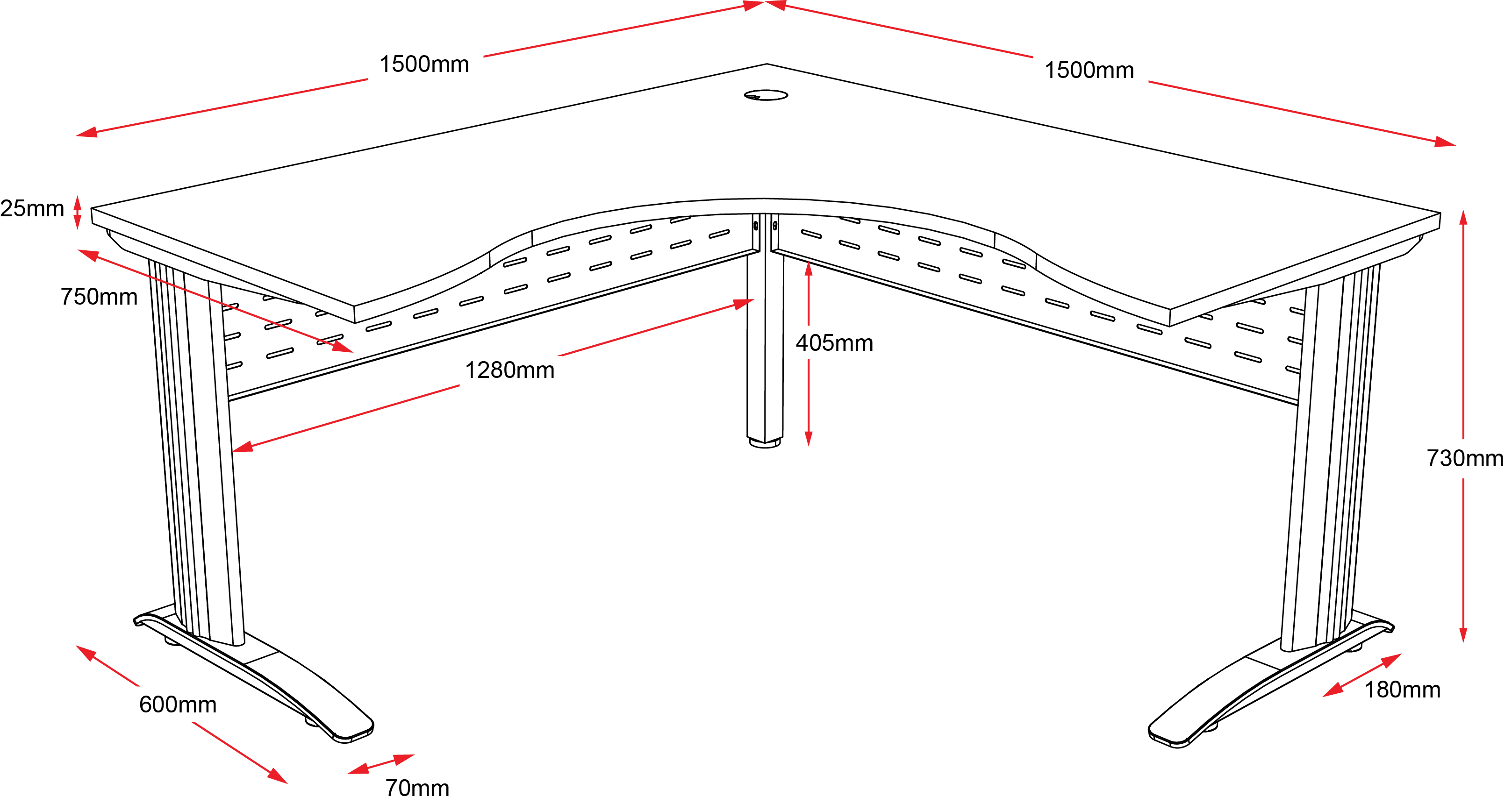 Corner workstations come with an E1 one piece top with cable tidy, perforated metal modesty panel and adjustable feet.