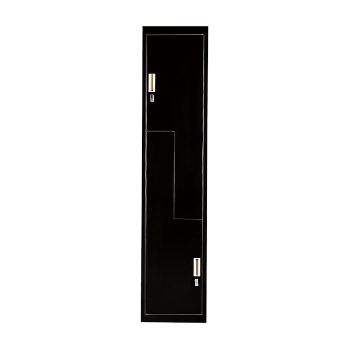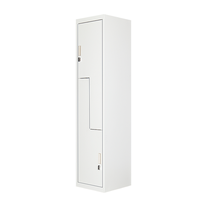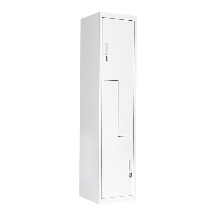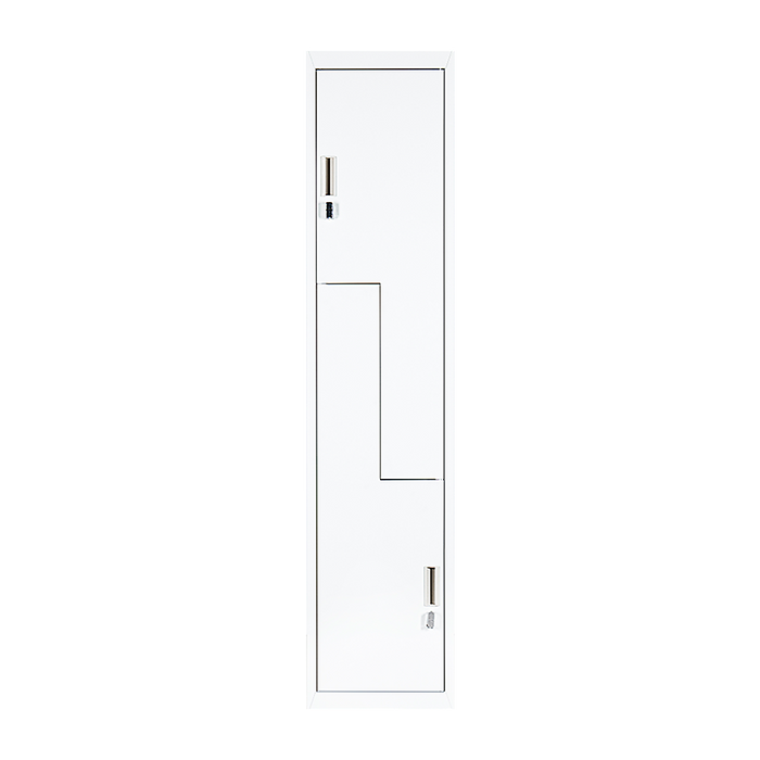 - 2 vertically stacked L-shaped locker compartments
